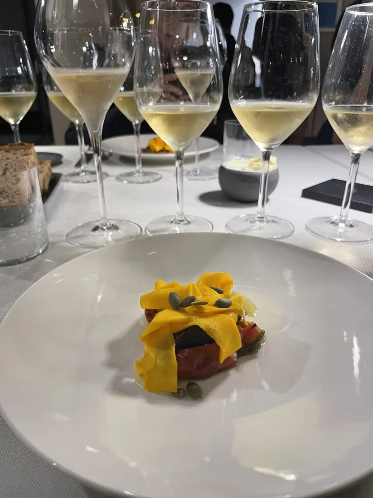 Tra le pietanze scelte, pomodorini, zucca, fichi e salvia, un piatto che, a prima vista, può sembrare semplice, ma che in realtà rivela una complessità sottile. A spiccare è la cura con cui vengono trattati i vegetali, veri protagonisti del piatto. Come primo, tagliolini con pesche ed elicriso, una pasta leggera e delicata, avvolta da un profumo dolce, grazie alla pesca. Un abbinamento insolito, ma incredibilmente riuscito.