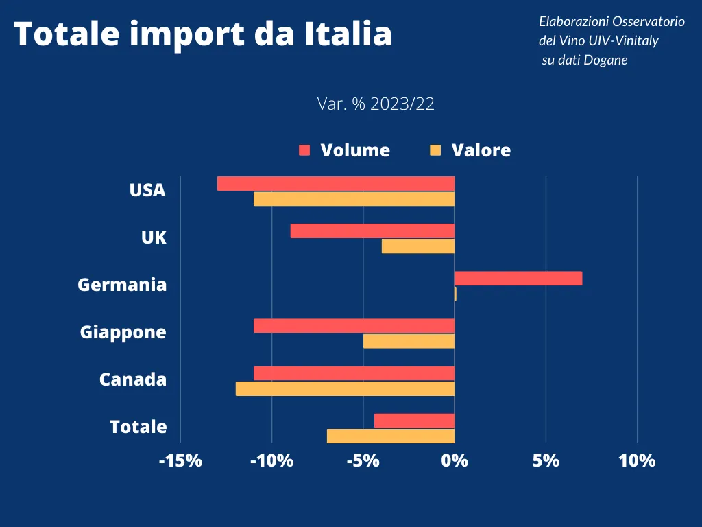 Frena l’import di vino italiano nelle 5 principali piazze mondiali nel 2023. Secondo l’Osservatorio di Unione italiana vini (Uiv), i dati finali relativi alle importazioni da Stati Uniti, Germania, Regno Unito, Canada e Giappone (che insieme valgono il 56% dell’export complessivo del Belpaese), per il prodotto made in Italy il 2023 si è chiuso infatti con un calo tendenziale del 4,4% nei volumi e del 7,3% nei valori, a 4,45 miliardi di euro.
