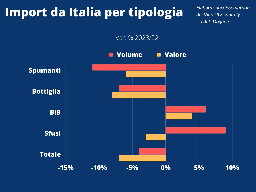 Particolarmente negativo, anche a causa di un eccesso di scorte detenute dai distributori che hanno condizionato gli ordini di tutto il 2023, il mercato negli Stati Uniti, che totalizzano un -13% a volume, ma anche in Canada e Giappone, entrambe a -11% e in Uk (-9%). In contrazione, nonostante il surplus di costi produttivi per le imprese, il prezzo medio (-3%), per effetto della crescita import di sfusi (+9%, dove però i listini crollano a -11%) e grandi formati (+6%) e al contestuale minore impatto di prodotti imbottigliati (-7%) e spumanti, giù dell’11% nei volumi ma unica tipologia a crescere nel prezzo medio (+5%).