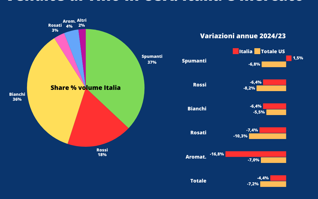 Secondo l’analisi, il 2024 si è chiuso con un calo a volume nelle vendite di vino italiano negli Usa del 4,4% a fronte di un deficit generale del totale mercato a -7,2%. Pagano maggiormente – nelle rilevazioni targate Sipsource presso il retail e l’horeca a stelle e strisce – i bianchi e i rossi, entrambi a -6,4%, mentre tengono gli spumanti italiani (+1,5%) che guadagnano importanti quote di mercato sui competitor. In difficoltà le principali denominazioni, fatta eccezione per Prosecco, Brunello di Montalcino e Barolo.