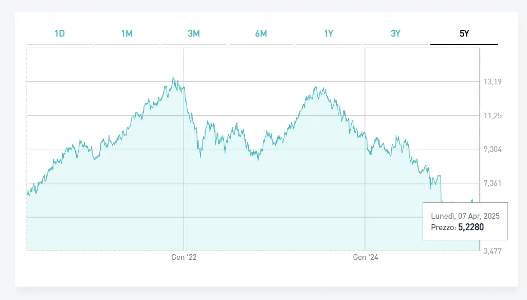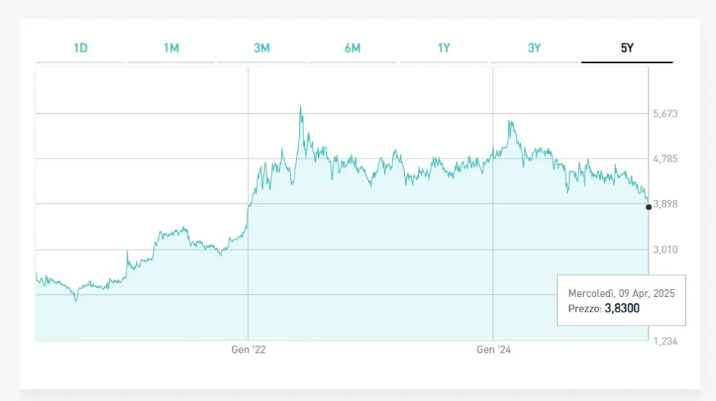 Campari – qui sopra il grafico a cinque anni – ha perso il 13,55% nell’ultimo mese, toccando i minimi da inizio anno. Una frenata netta per il gruppo milanese, che aveva costruito gran parte della sua crescita internazionale proprio sul mercato statunitense. La perdita di valore negli ultimi dodici mesi supera il 40% e Campari ha proseguito nella campagna di riacquisto di azioni proprie (,6 milioni rilevate sulle 8 messe a budget). Wall Street, oggi, non è più terra promessa: i nuovi dazi alzano il prezzo al consumo e rischiano di intaccare la marginalità dei prodotti premium, proprio nel momento in cui la domanda americana mostra i primi segnali di saturazione.