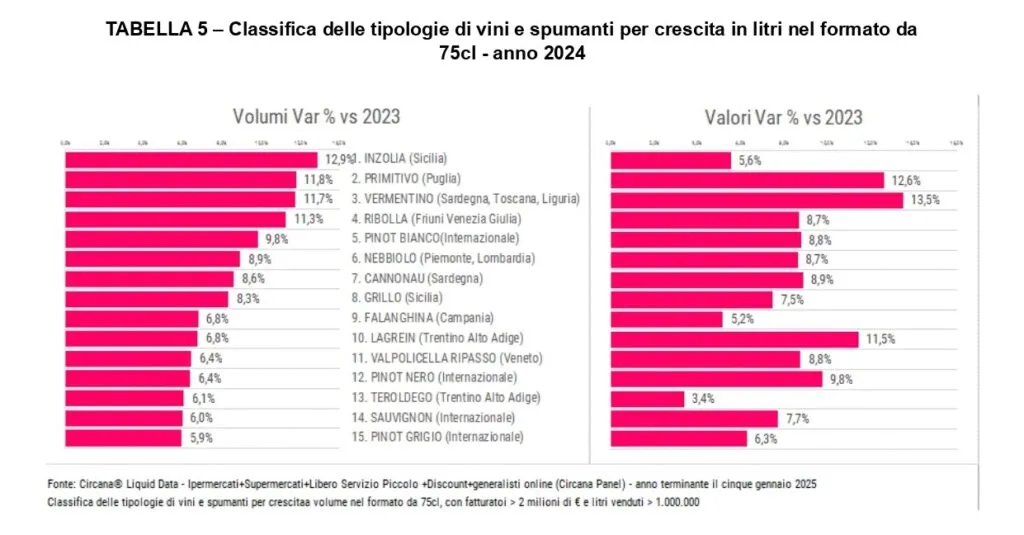 Secondo Circana, il settore chiude il 2024 con un -1,3% a volume sull’anno precedente (fatta eccezione per lo spumante che sembra aver intrapreso un percorso diverso), in parte compensato da un +2,2% a valore. Performance positiva per i vini in bottiglia a denominazione d’origine che registrano un +0,7%. Ai rosati il dato di crescita più significativo. Il costo medio per il vino a denominazione d’origine in bottiglia (Doc, Docg, Igt) è di 5,57 euro al litro, con un aumento medio del 2% sull’anno precedente, decisamente più contenuto rispetto al dato 2023, che aveva registrato aumenti superiori al 6%.